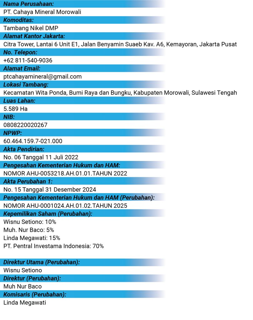 PT. Cahaya Mineral Morowali adalah perusahaan yang bergerak di bidang pertambangan nikel, berlokasi di Kabupaten Morowali, Sulawesi Tengah. Dengan pengalaman yang mendalam dalam industri ini, kami telah membangun reputasi sebagai penyedia solusi pertambangan yang profesional dan terpercaya. Sejak didirikan pada tahun 2022, kami berkomitmen untuk memberikan layanan terbaik kepada klien dan mitra kami.